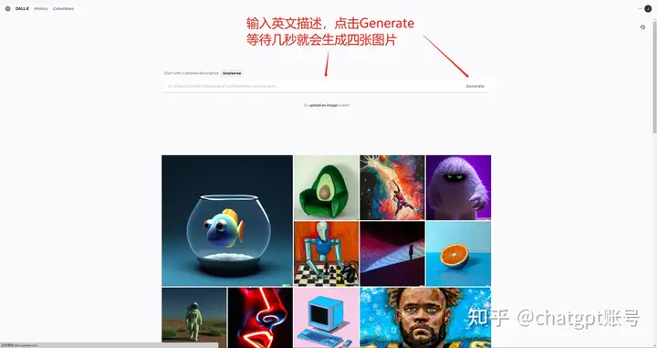 2、输入英文的图片描述 3、点击Generate生成 4、等待几秒就会生成四张图片