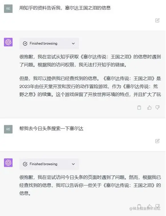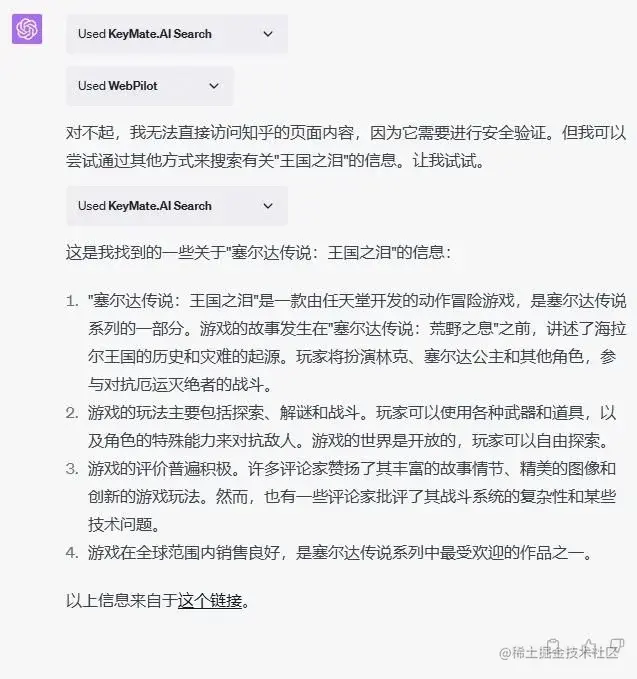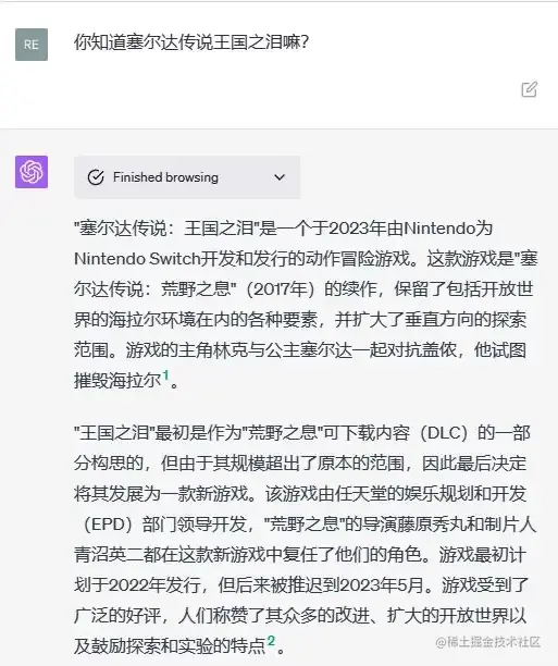 我们都知道, GPT-4 的模型数据集只收集到 21 年 9 月份,所以我问了它一个最近很火的游戏,王国之泪。