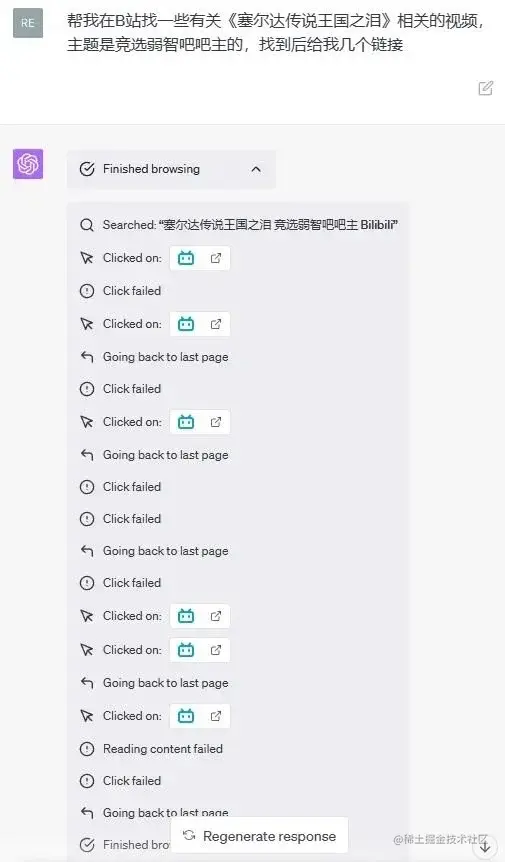 不过呢,当我想要些更细致的信息时, GPT-4 虽然会尝试去浏览网页,但,都进不去。