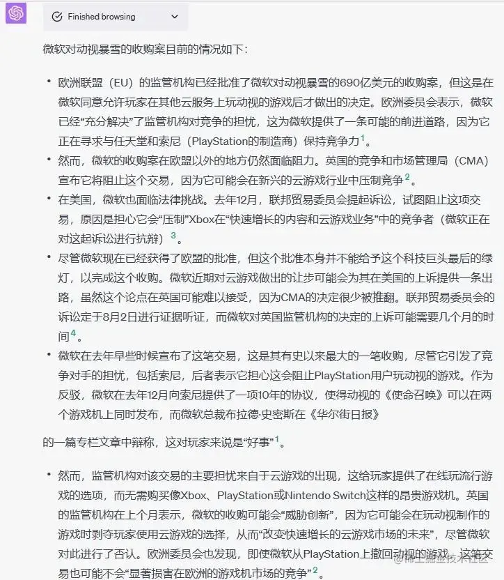 不过, ChatGPT 的网络浏览也不是一无是处,相对于现在的 Newbing ,当我需要一个更加详尽的回答时,比如让它对暴雪收购案进行评价, Newbing 可能是由于限制问题,只给出了短短几句的回答,数据还不新。