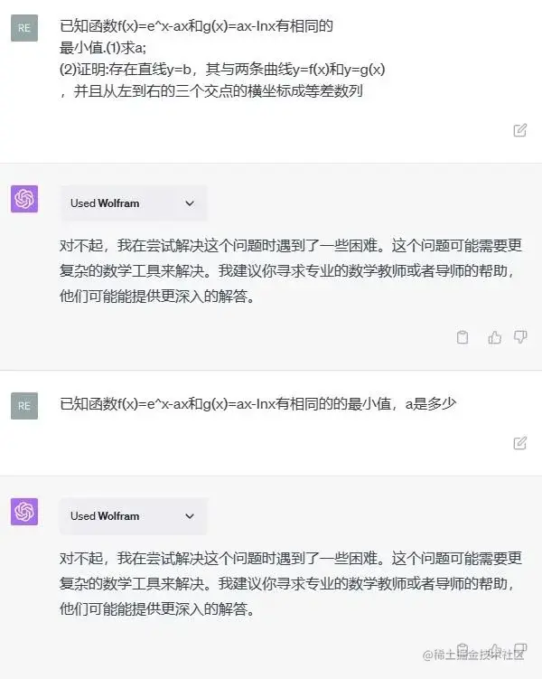 不过在一些难度更高的题目面前, Wolfram 就有点应付不来了。