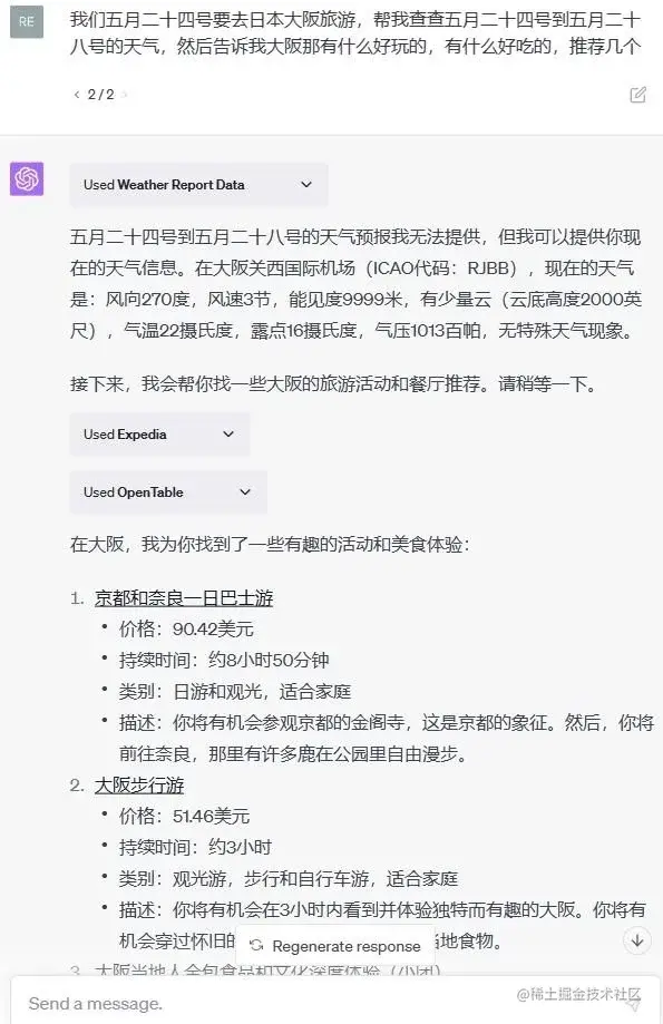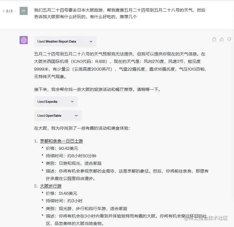 首先我使用了 Weather Report Data ( 天气报道插件,这里有个伏笔), Expedia ( 旅游插件 )还有 OpenTable ( 订餐插件 )这三个插件去帮忙制定这几天的行程。