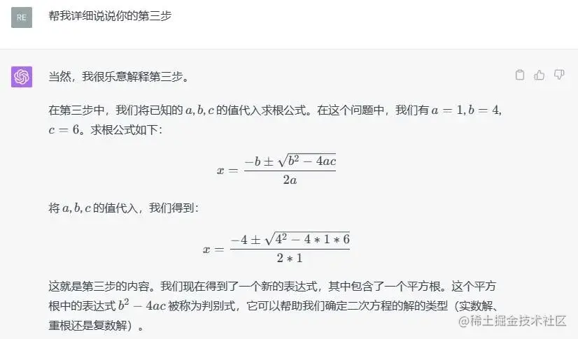 在答案上, GTP-4 除了能帮你把过程给写出来,在解答过程中,当我要求它去对一些关键步骤进行解释时,这个回答就更详细了。