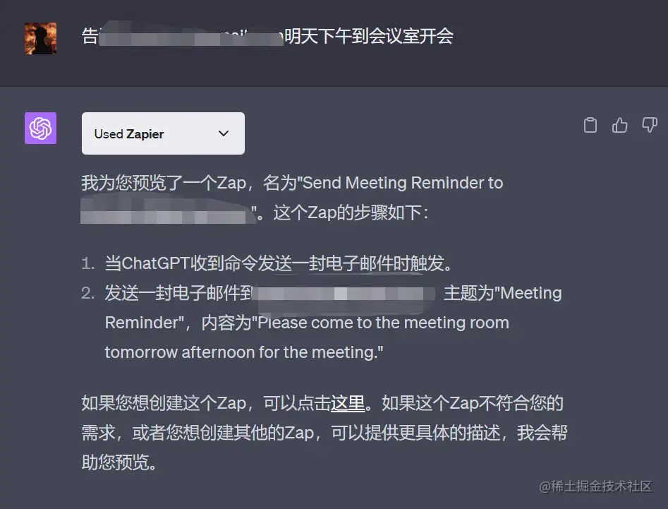 ChatGPT 首先会生成一个 Zap 预览,并且会自动拟好邮件的内容给我们过目。