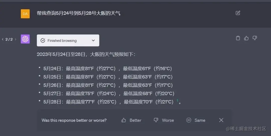 所以咱只好再重新切换使用 “Web browsing” 来查询,这才知道未来的天气。