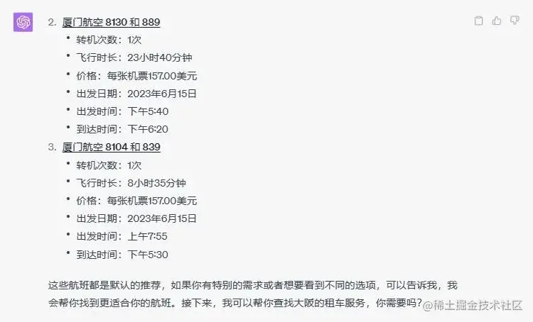 首先,在我没有明确说明从哪出发的情况下,它直接给我推荐了从北京飞往日本的机票。